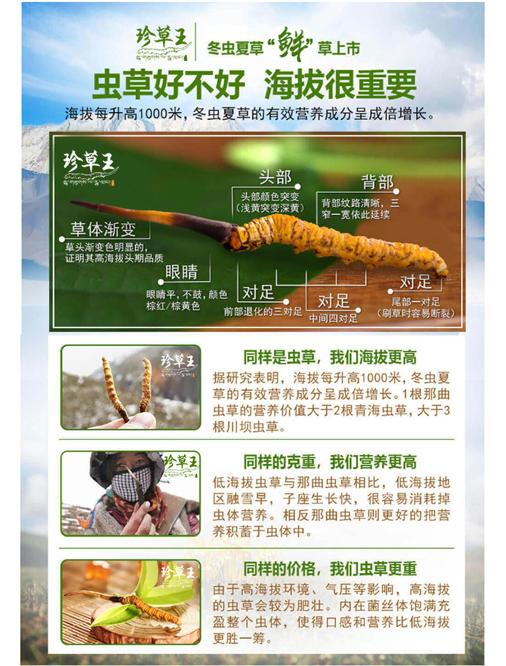 因为:干草市场中,造假手段层出不穷,新鲜冬虫夏草保持原生态直观辨别,以根计价,不易造假。